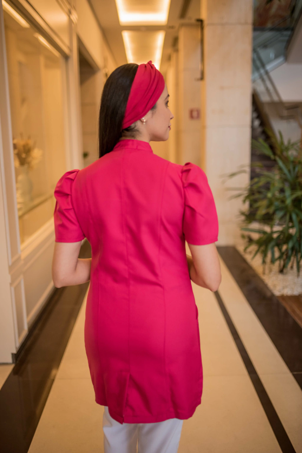 Com um design elegante e moderno, o Jaleco Bela destaca-se pela modelagem com recortes princesa, que valoriza a silhueta feminina. Confeccionado em gabardine de alto padrão, possui gola padre, bolsos laterais e mangas curtas, garantindo conforto e frescor.