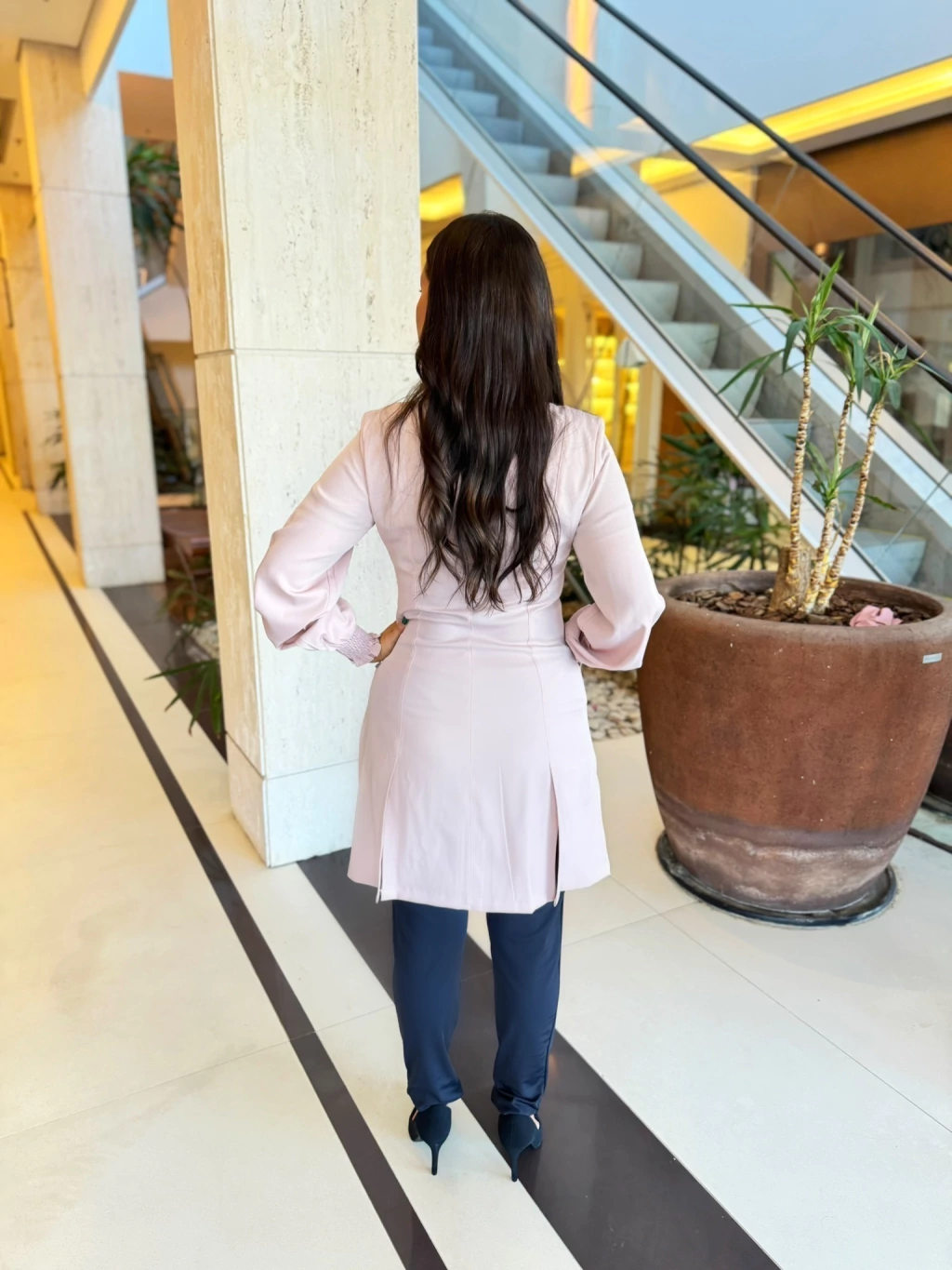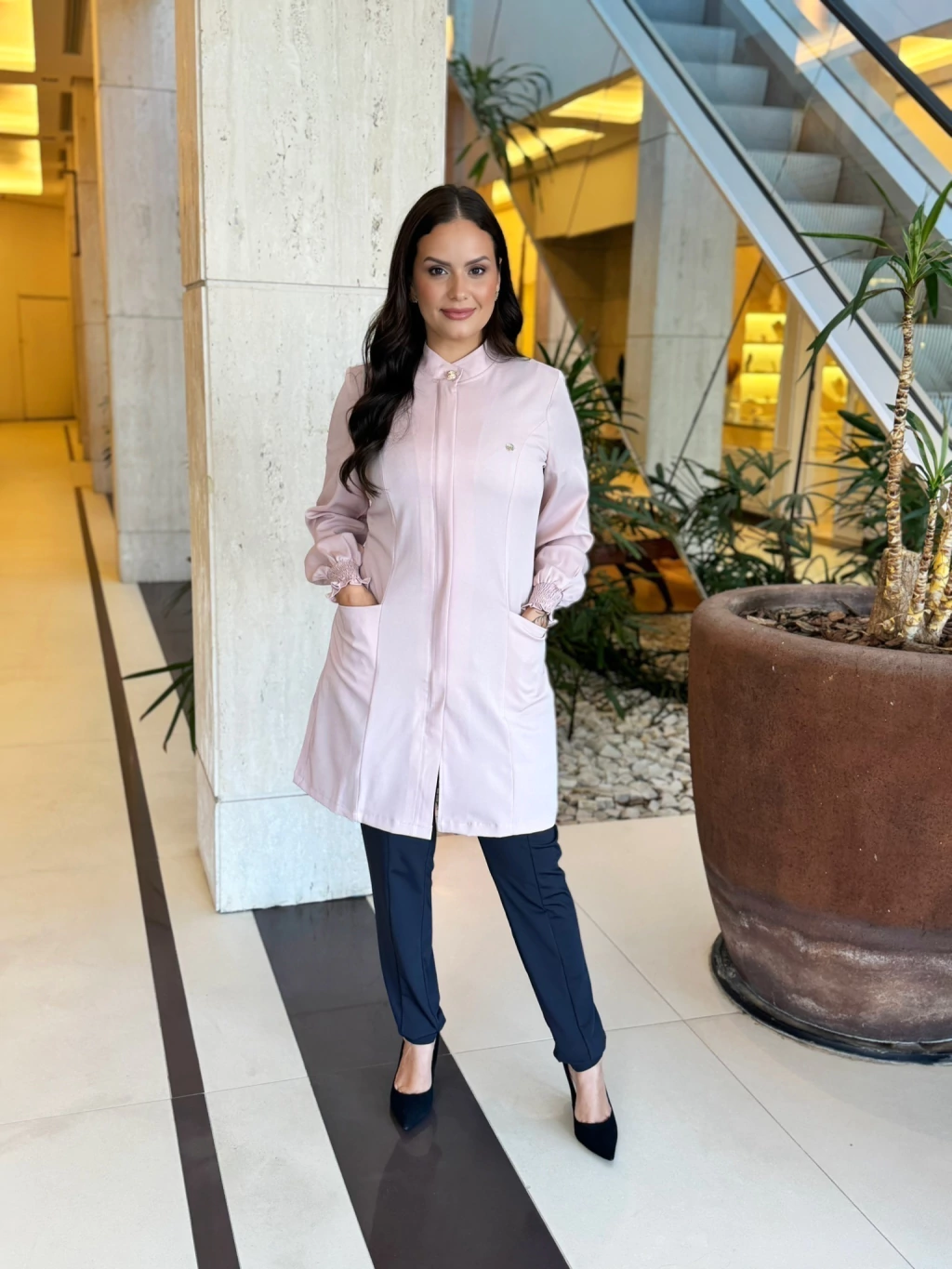 O Jaleco Emily foi desenvolvido para proporcionar sofisticação e conforto, combinando uma modelagem impecável que valoriza a silhueta. Seu design moderno conta com gola padre e um delicado botão dourado no fecho, enquanto os punhos em elastex adicionam um toque especial de charme. Além disso, possui dois bolsos laterais inferiores e fechamento em zíper, garantindo praticidade para a rotina.