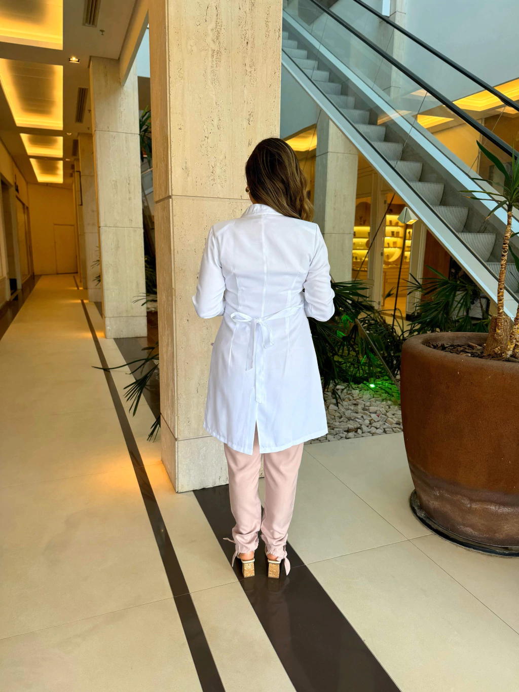 O Jaleco Estela foi criado para unir elegância e conforto, destacando-se por sua modelagem impecável que valoriza a silhueta. Seu design moderno conta com gola estrela e fecho frontal com dois botões encapados, trazendo um toque sofisticado. Nas costas, um delicado laço adiciona um ar romântico à peça. Além disso, possui dois bolsos laterais inferiores, proporcionando praticidade para o dia a dia. Para as mulheres que tem quadril maior ele é perfeito, pois da muito movimento.