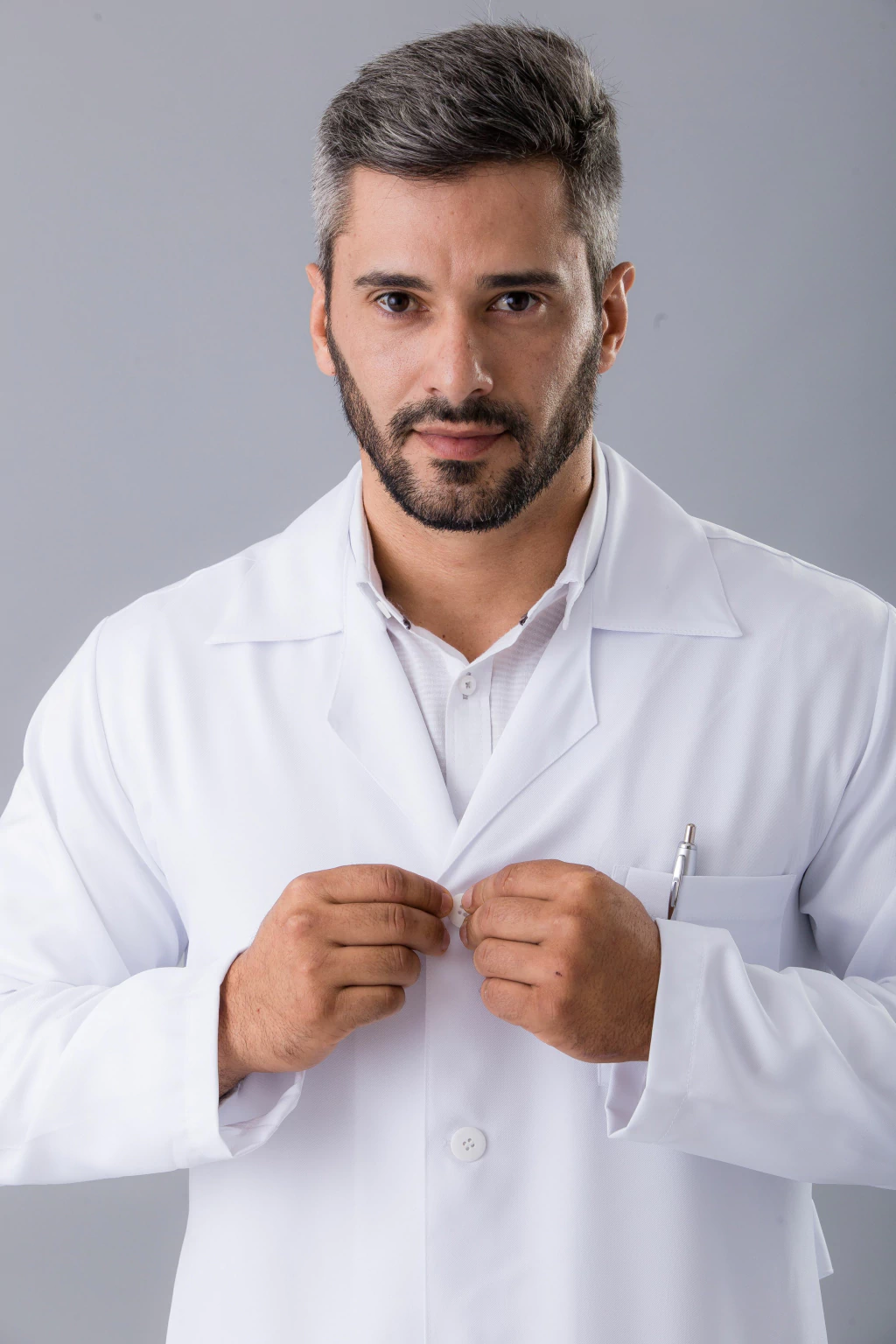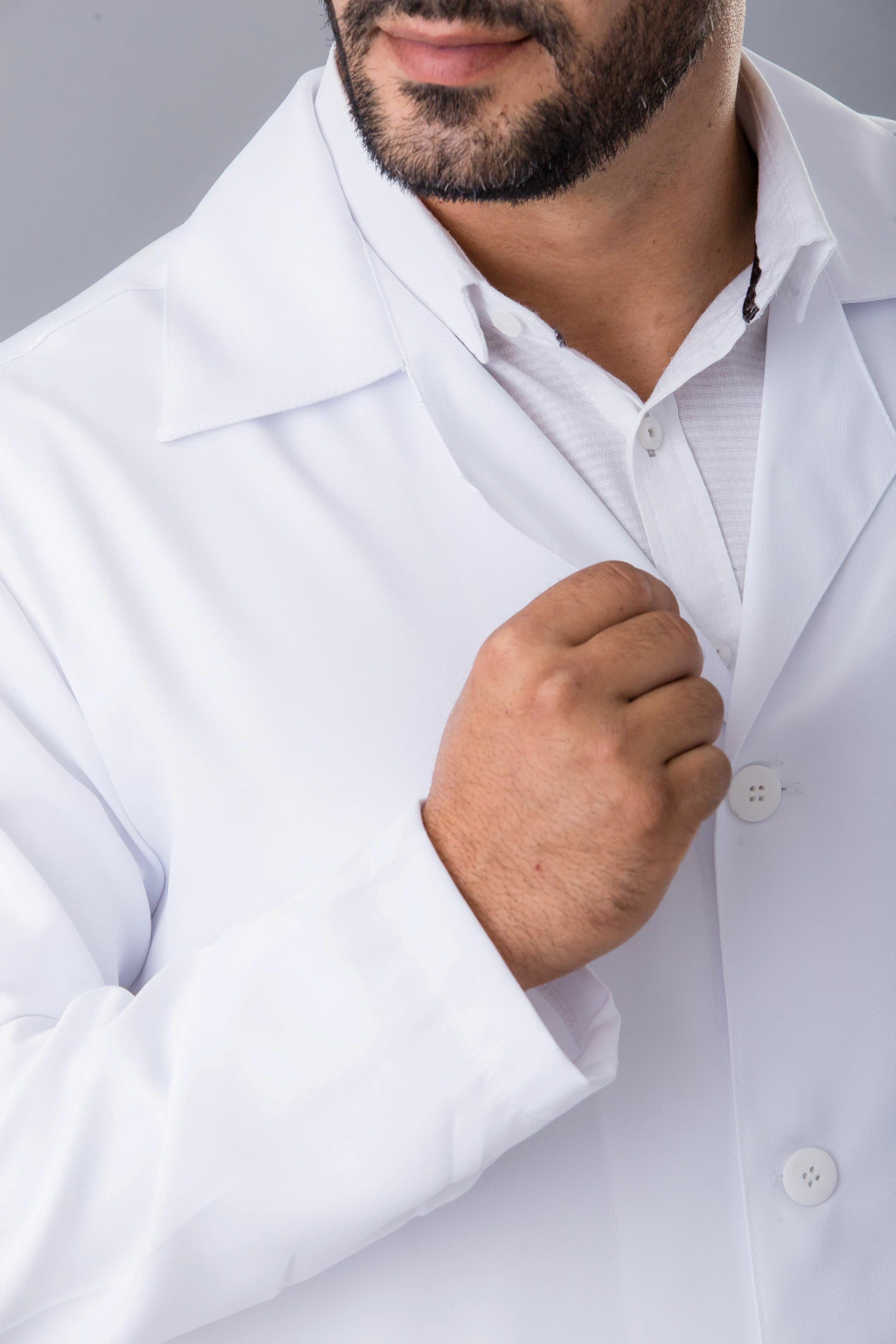 Com três bolsos quadrados grandes ele tem um bom espaço para armazenamento, além de uma abertura lateral que possibilita o contato com os bolsos da roupa que o profissional da saúde veste por baixo do jaleco.