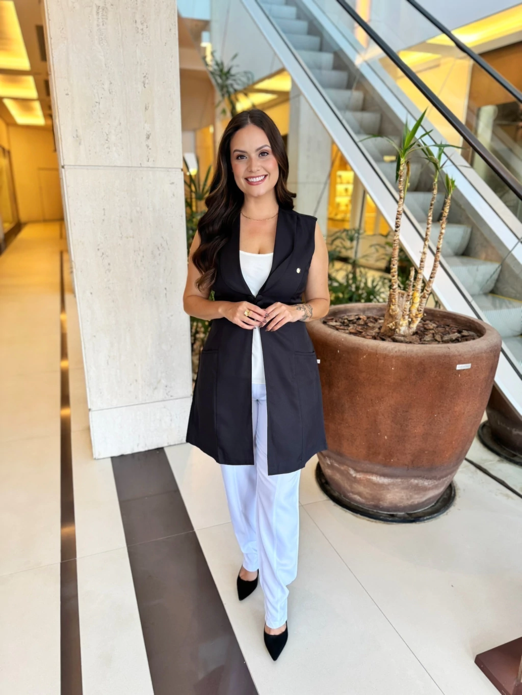 Com design moderno e feminino, ele possui modelagem acinturada, sem mangas, decote em V profundo e fechamento com botões forrados no mesmo tecido — um detalhe que valoriza ainda mais a peça. Os bolsos frontais garantem funcionalidade para a rotina profissional, e o comprimento alongado confere um visual elegante e versátil.
