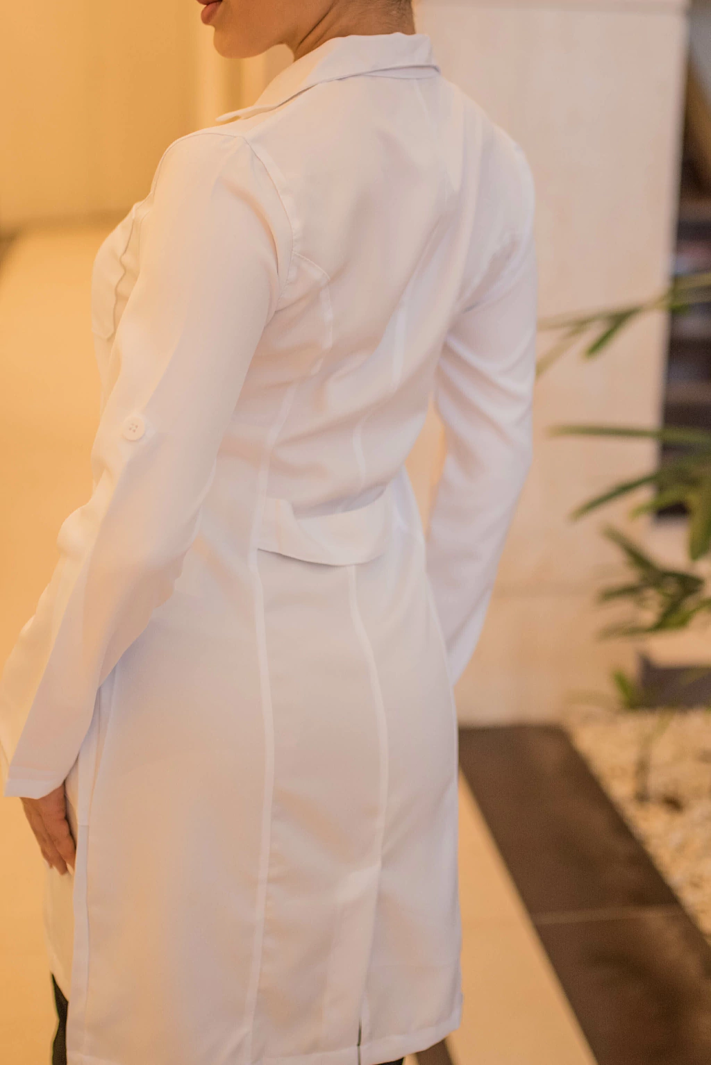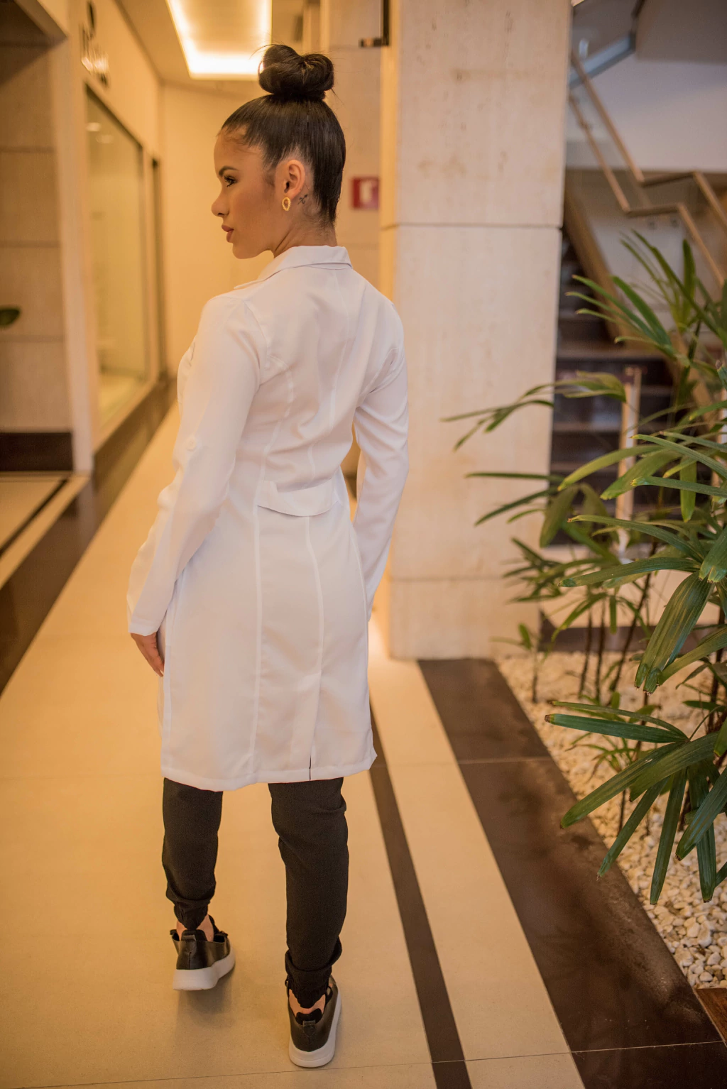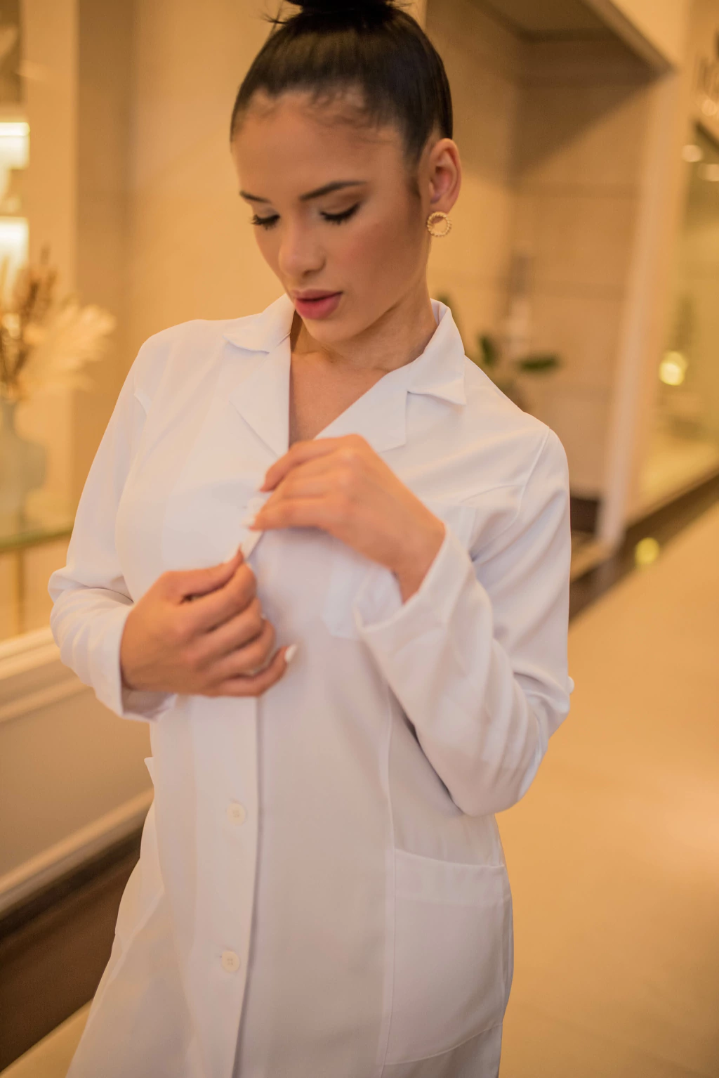 Com um design clássico e atemporal, este jaleco une discrição e feminilidade em uma peça prática e bem estruturada. Confeccionado em gabardine, conta com gola esporte, fechamento por botões e três bolsos frontais estratégicos – um superior no lado esquerdo e dois inferiores.