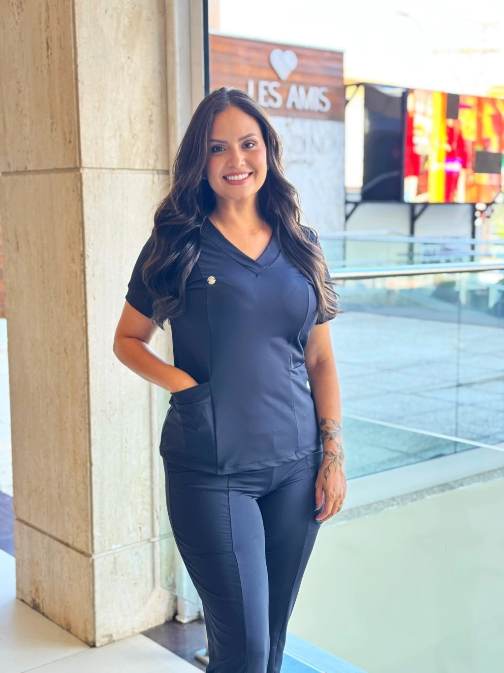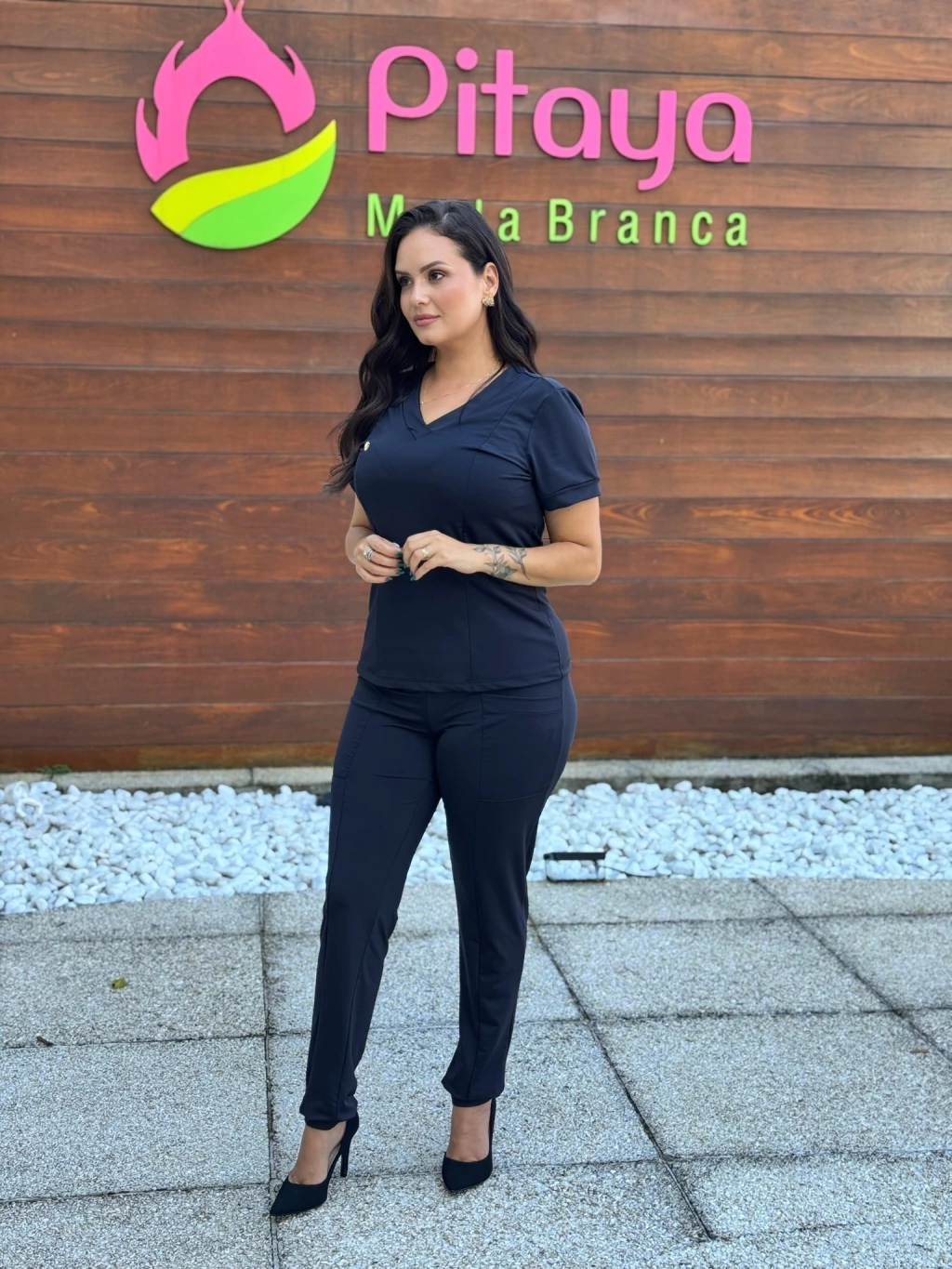 A modelagem foi projetada para um ajuste perfeito ao corpo, realçando um visual moderno e profissional. O decote em "V" e os bolsos inferiores na blusa garantem funcionalidade e estilo. A calça completa o conjunto com um ajuste confortável com elástico na cintura que te traz ainda mais praticidade.