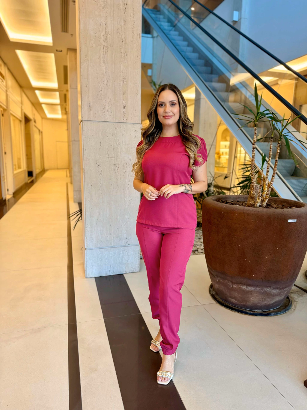 O Scrub Tamris é confeccionado no tecido gabardine, conta com uma modelagem moderna, em alfaiataria, blusa em gola redonda e manga tulipa, fechamento nas costas com um delicado botão em pérola, recortes frontais e nas costas para cinturar.